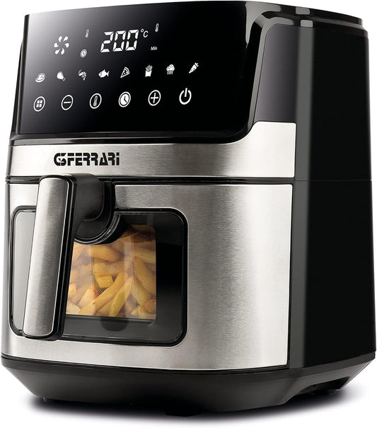 G3Ferrari Friggisano Visual Hot Air Fryer, 1700 W, 6.5 L, 8 Programmes, Digital Display, BPA & PFOA Free, Timer, Interior Lighting, Recipe Book Included, Silver Grey/Black