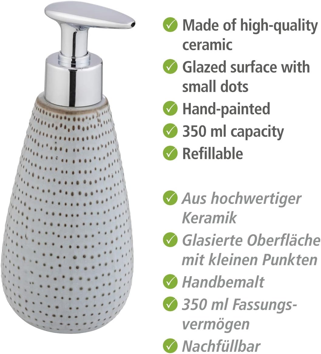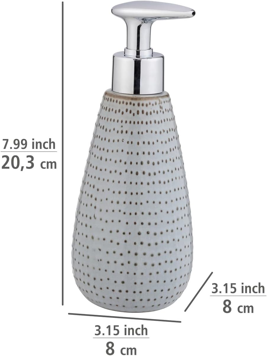 - Box contents: 1 x Bellante soap dispenser in light blue by WENKO, refillable pump dispenser for up to 350 ml liquid soap or detergent, made of high-quality ceramic with glazed surface, dimensions (W x D x H): 8 x 20.3 cm.