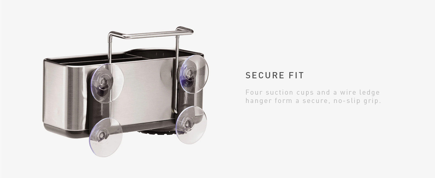 - SECURE FIT - Four suction cups and a wire ledge hanger form a secure, no-slip grip.