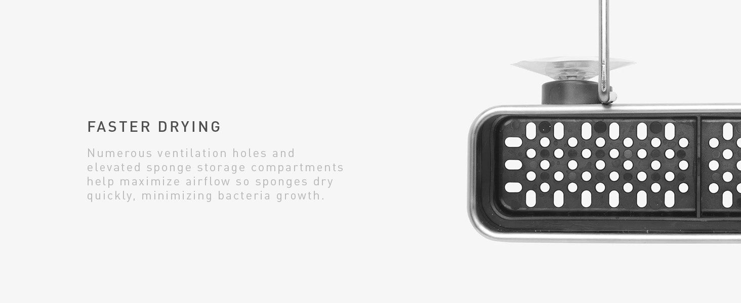 - FASTER DRYING - Numerous ventilation holes and elevated sponge storage compartments help maximize airflow so sponges dry quickly, minimizing bacteria growth.