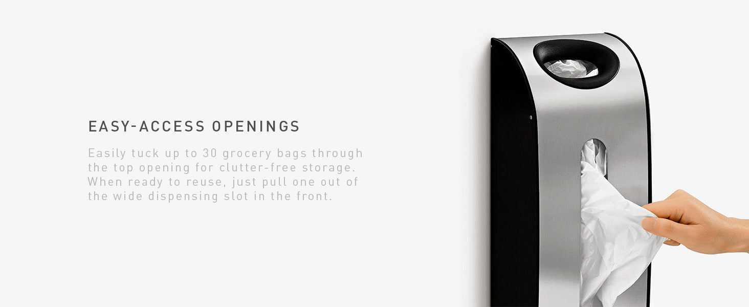 - EASY-ACCESS OPENINGS - Easily tuck up to 30 grocery bags through the top opening for clutter-free storage. When ready to reuse, just pull one out of the wide dispensing slot in the front.